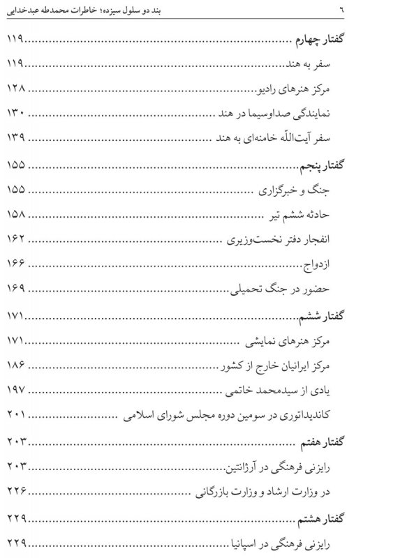 گفتار ششم دربرگیرنده فعالیتهای راوی در مرکز هنرهای نمایشی، مرکز ایرانیان خارج از کشور و دورانی است که وی در وزارت ارشاد اسلامی و تحت مدیریت سیدمحمد خاتمی به خدمت پرداخته است.